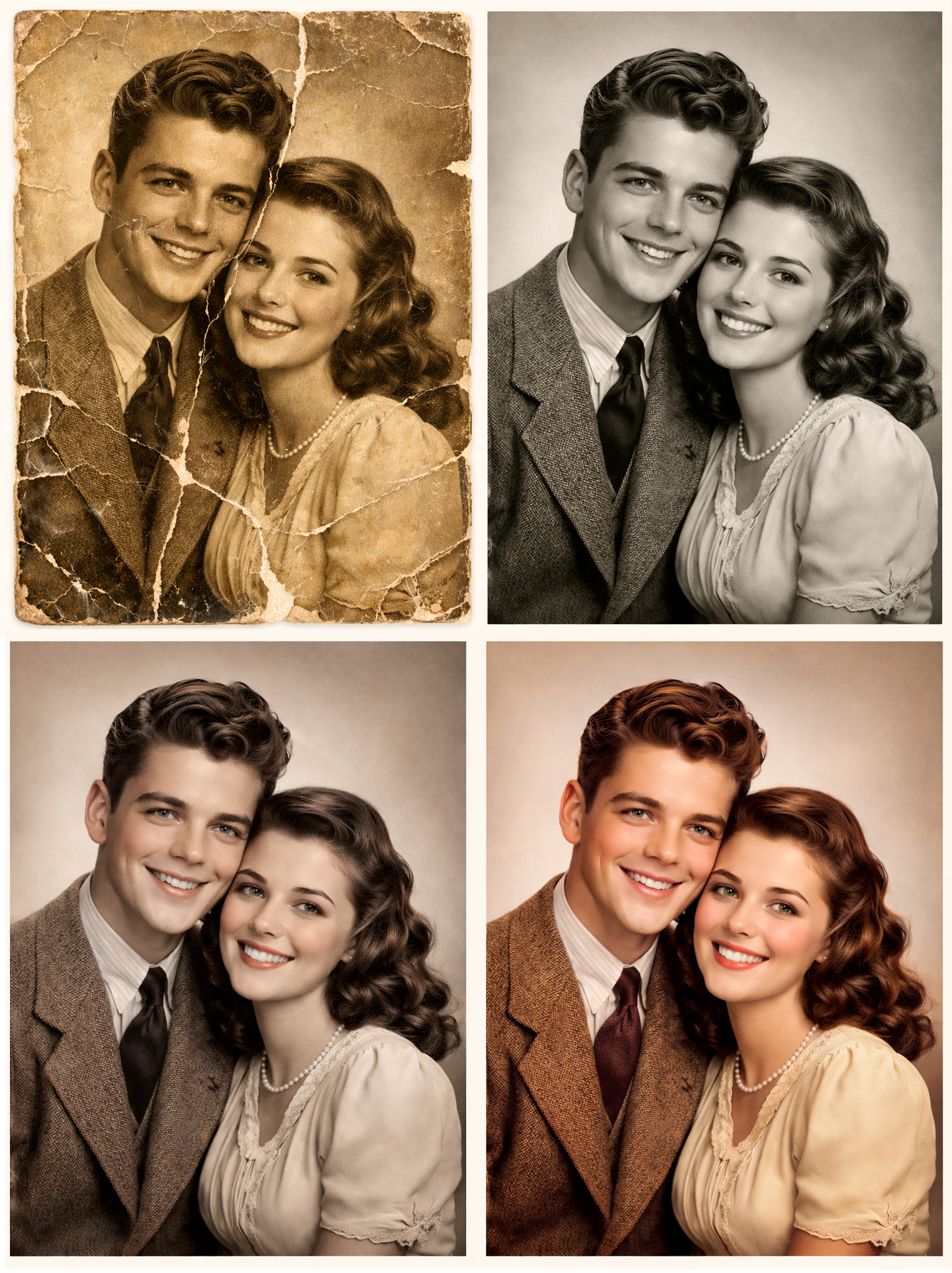 Vergilbte, verkratzte oder stark beschädigte Fotos müssen kein verlorenes Stück Erinnerung bleiben. Mit moderner digitaler Fotorestauration erwecken wir alte Bilder zu neuem Leben. Dank neuester Technik und viel Feingefühl werden Farben aufgefrischt, Kratzer und Risse entfernt sowie fehlende Bildbereiche detailgetreu rekonstruiert. So entstehen aus nahezu zerstörten Vorlagen wieder klare, ausdrucksstarke Bilder – originalgetreu, hochwertig und bereit für die Zukunft.